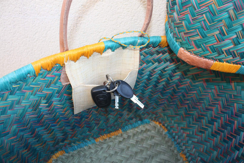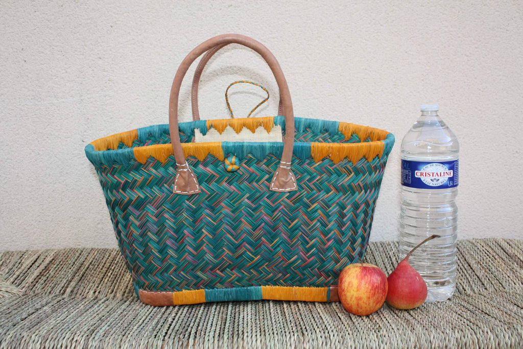 Panier à courses de Madagascar - Cabas Turquoise & Orange - Sac tressé Artisanal - 3 tailles au choix -