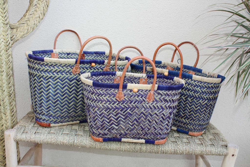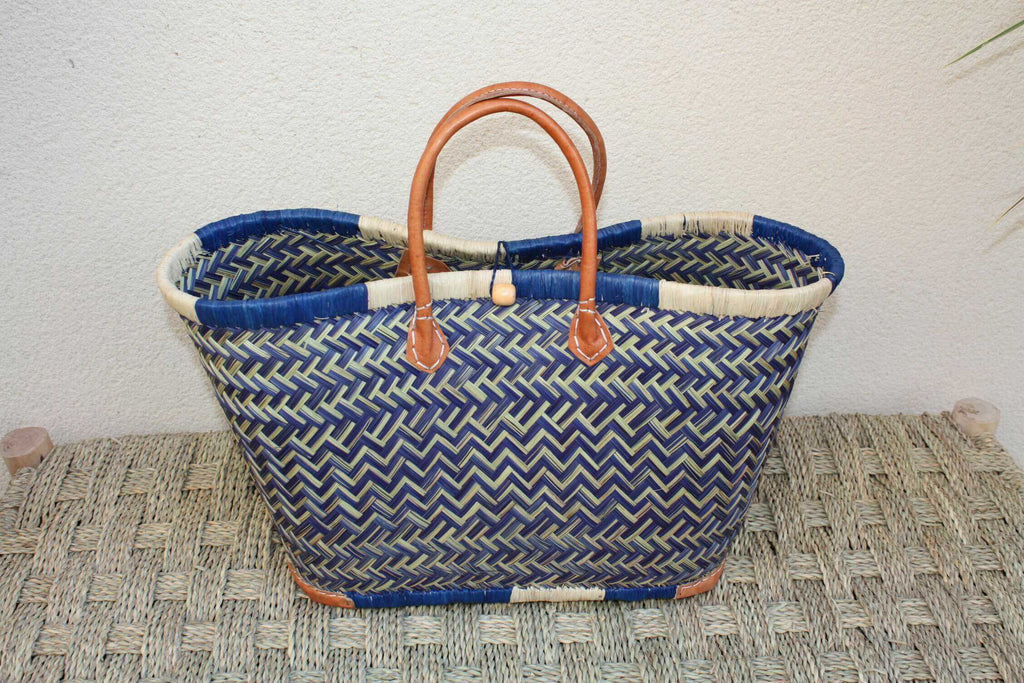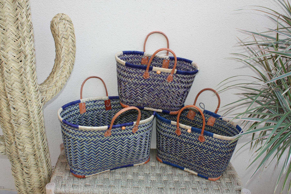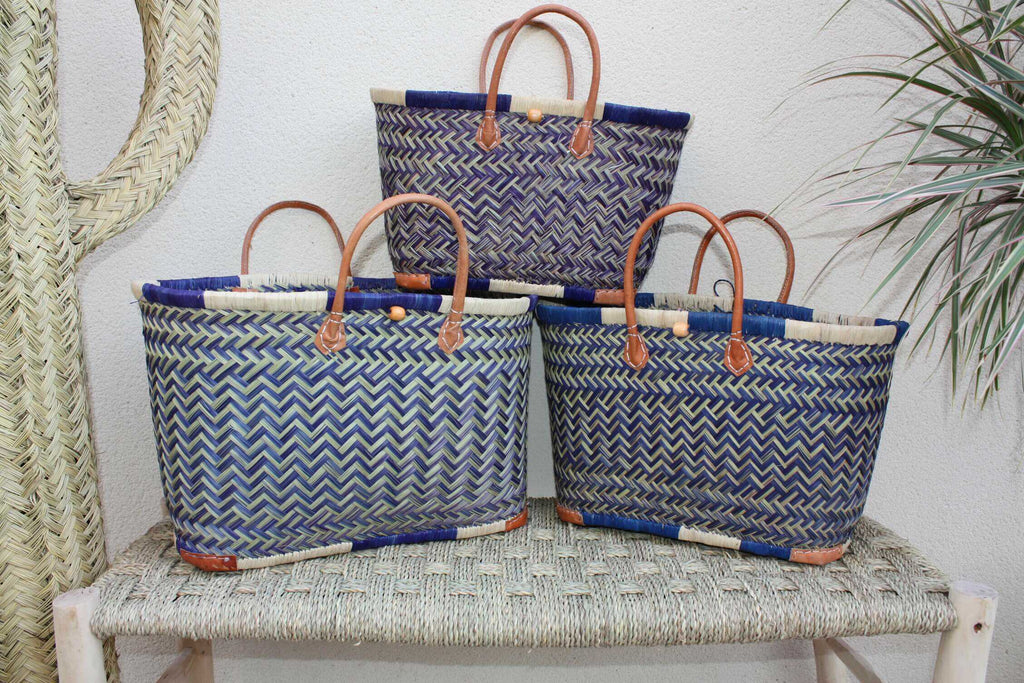 Sac Cabas de courses - PANIER de MADAGASCAR - Bleu & Naturel - Tressé Main - 3 tailles au choix - marché plage osier paille