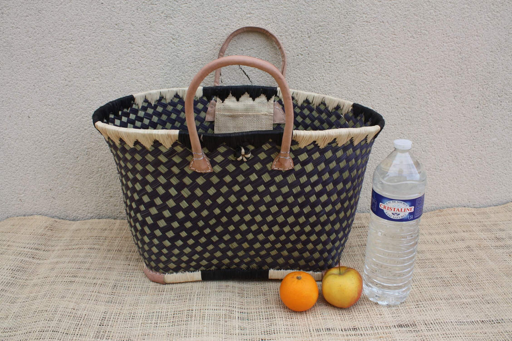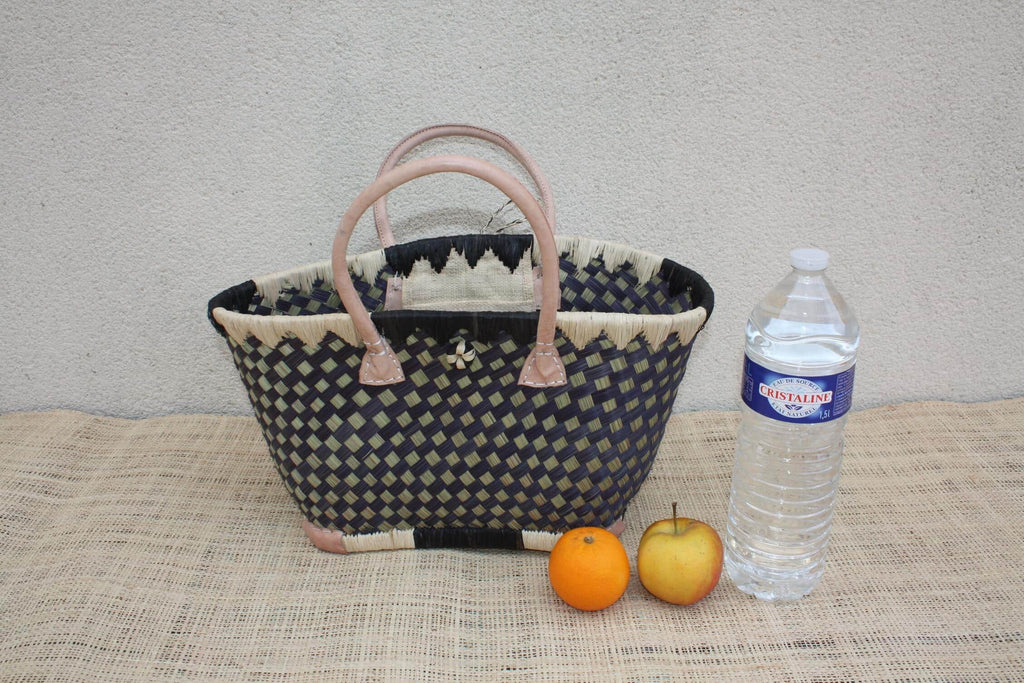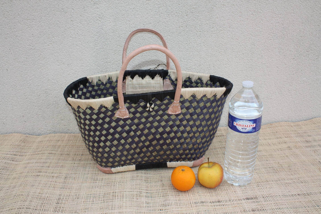 Panier osier tressé noir naturel fait main, sac cabas bohème, panier marché artisanal, sac plage anses cuir, 3 tailles