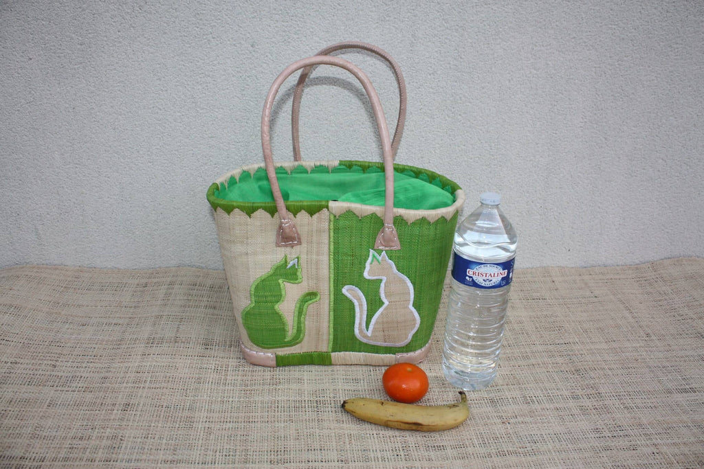 Craquez pour ce superbe panier vert brodé motif chat, entièrement réalisé à la main à Madagascar.