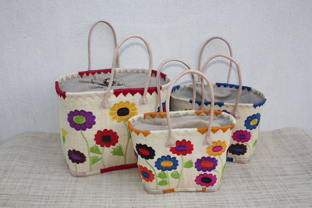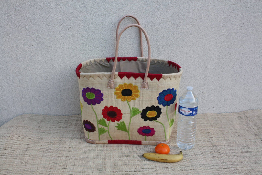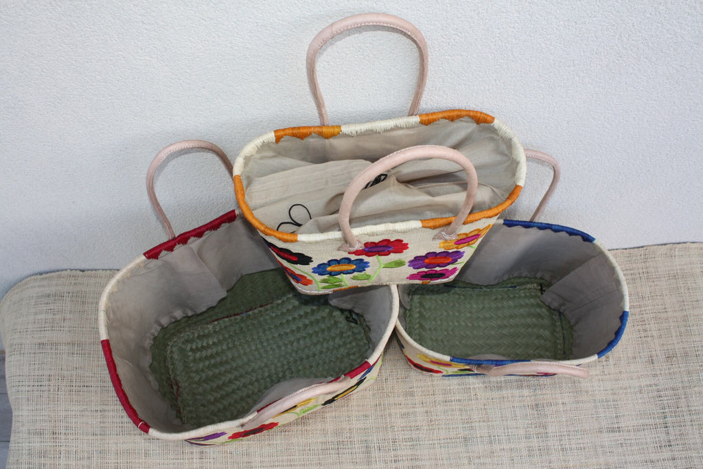 Panier brodé fleurs fait main – Cabas raphia artisanal avec pochon NATUREL – Sac bohème marché plage anses cuir (3 tailles)