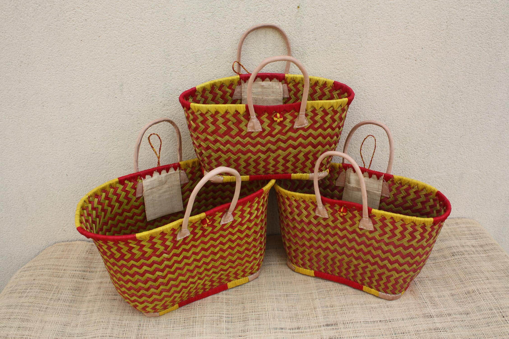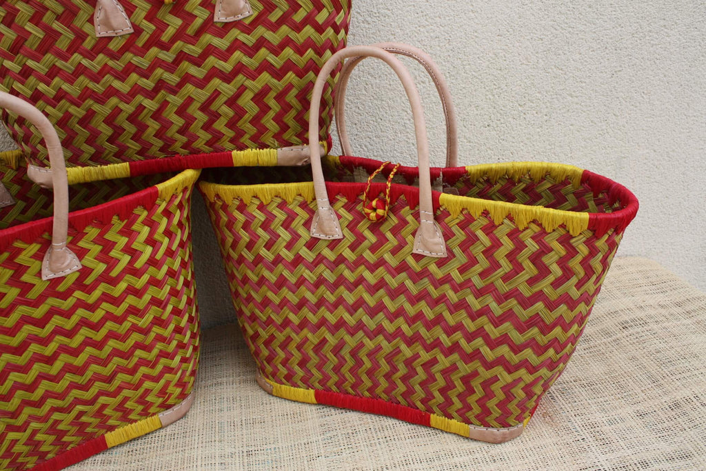 Panier paille rouge & jaune – Sac plage cabas osier marché artisanal Madagascar, rotin tressé main, anses cuir (3 tailles)