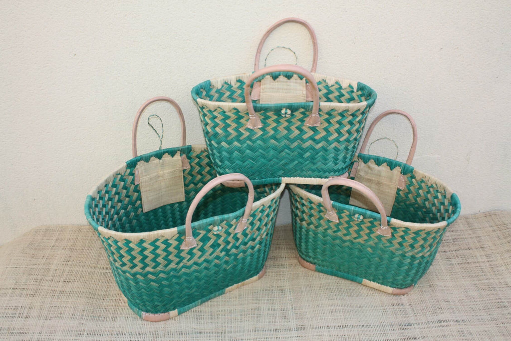 Panier en osier de Madagascar TURQUOISE artisanal – Sac cabas tressé à la main avec anses en cuir – Style bohème chic