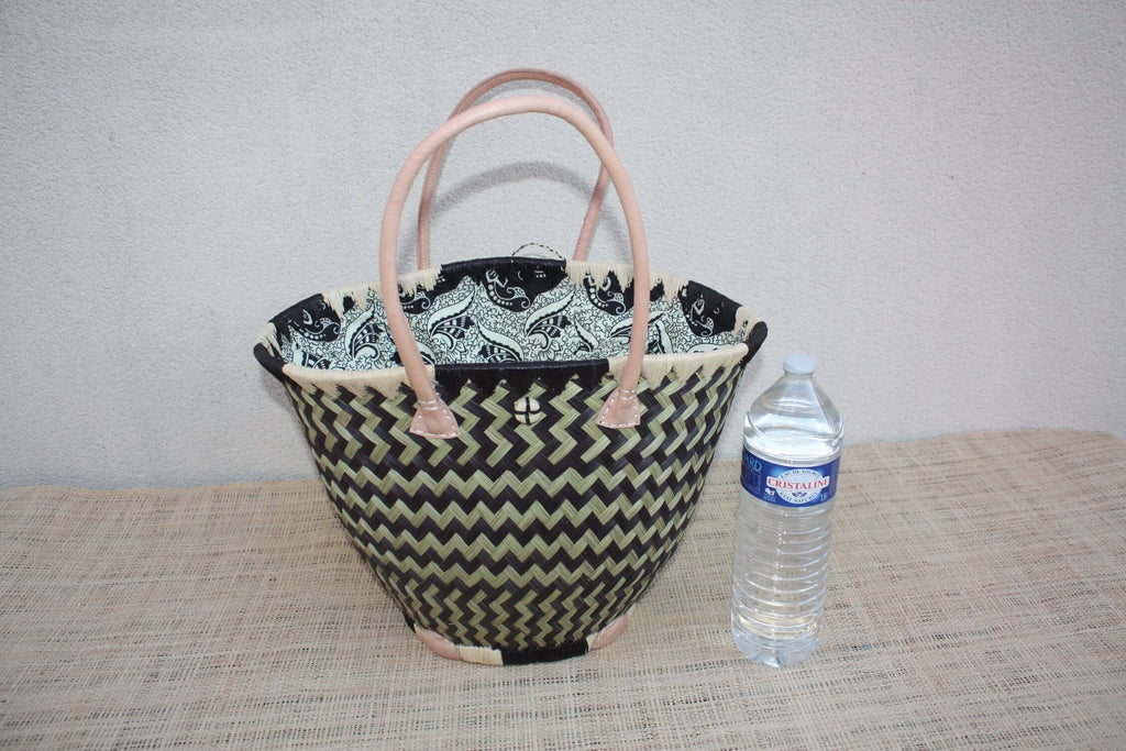 Panier Rond Wax Africain Noir & Naturel – Sac Cabas Bohème en Fibres Naturelles – Panier Marché Plage avec Anses Cuir – Fait Main Madagascar