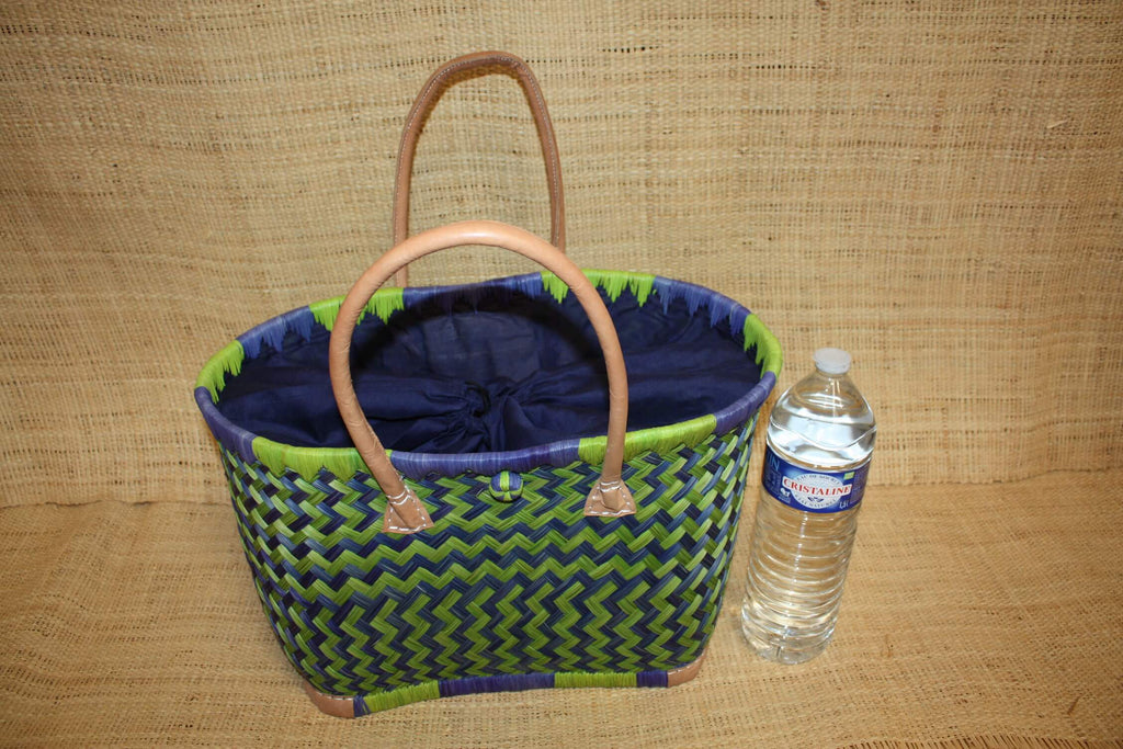 Panier BLEU & VERT - Cabas osier marché Sac paille plage Panier rotin courses - Tissu pochon avec lacet de serrage - 3 TAILLES -