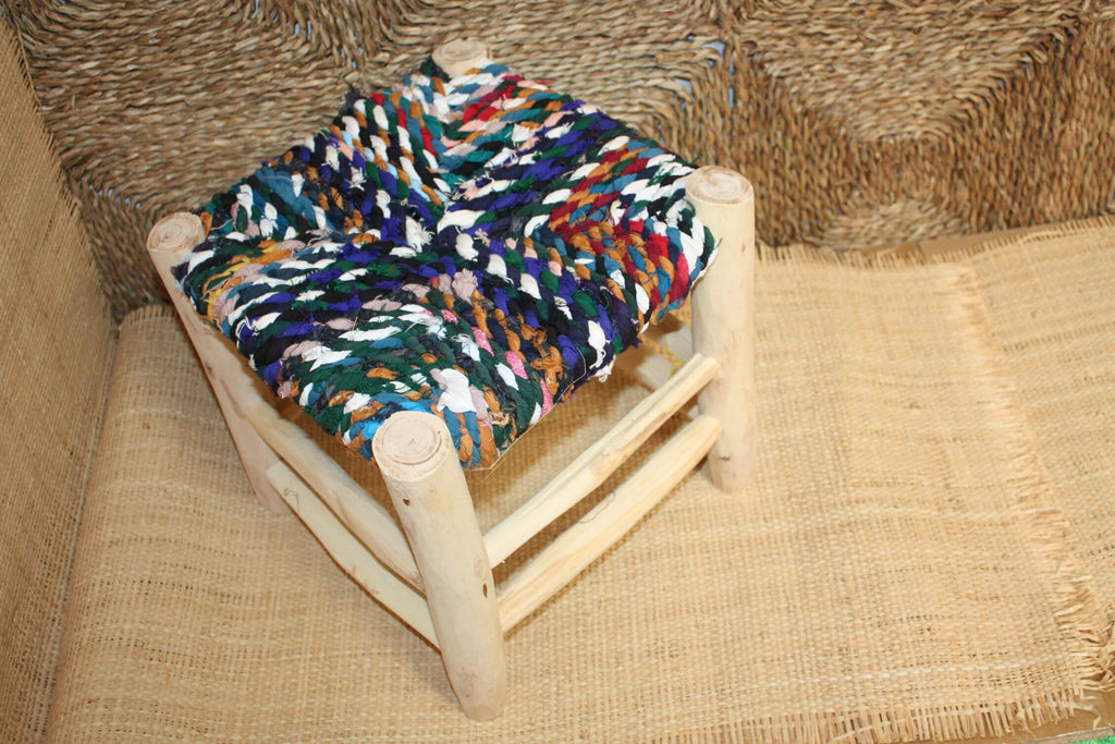 TABOURET MAROCAIN - Bois d'Eucalyptus & Tissu recyclé - Artisanat Naturel - Décoration Durable