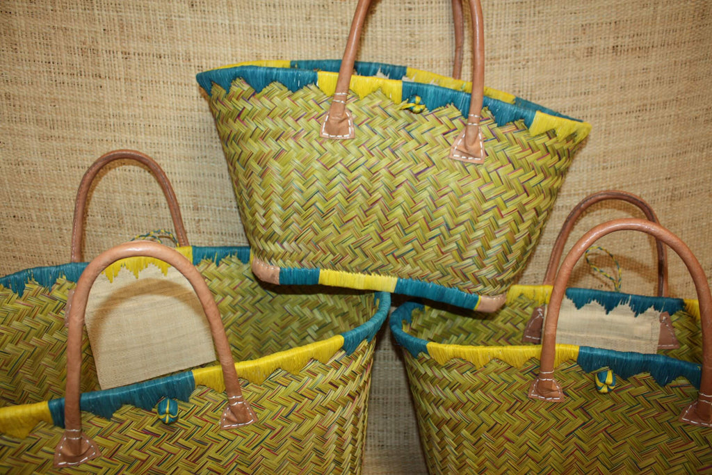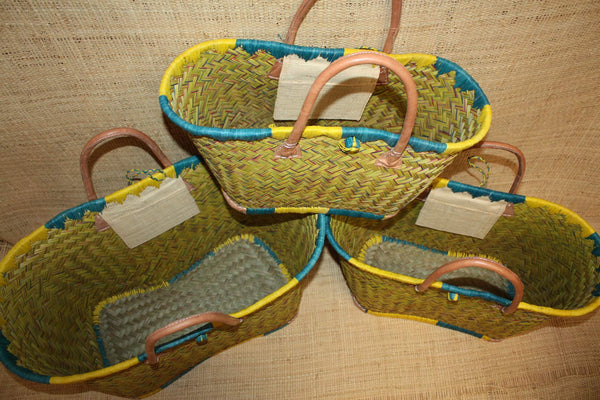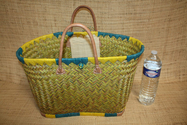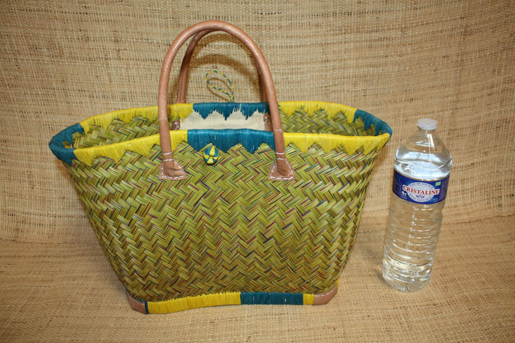 Beau panier à courses - MADAGASCAR - Sac Cabas Jaune & Turquoise - Tressé à la main - 3 tailles au choix - plage osier paille