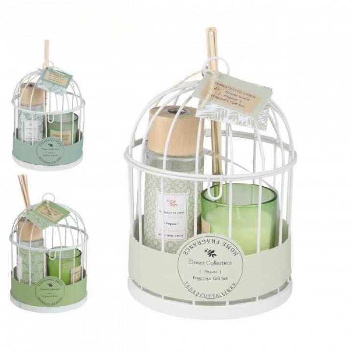 Découvrez notre coffret cadeau unique : une bougie parfumée et un diffuseur dans un élégant coffret cage en métal.