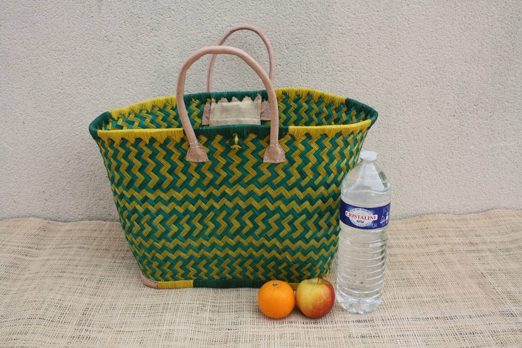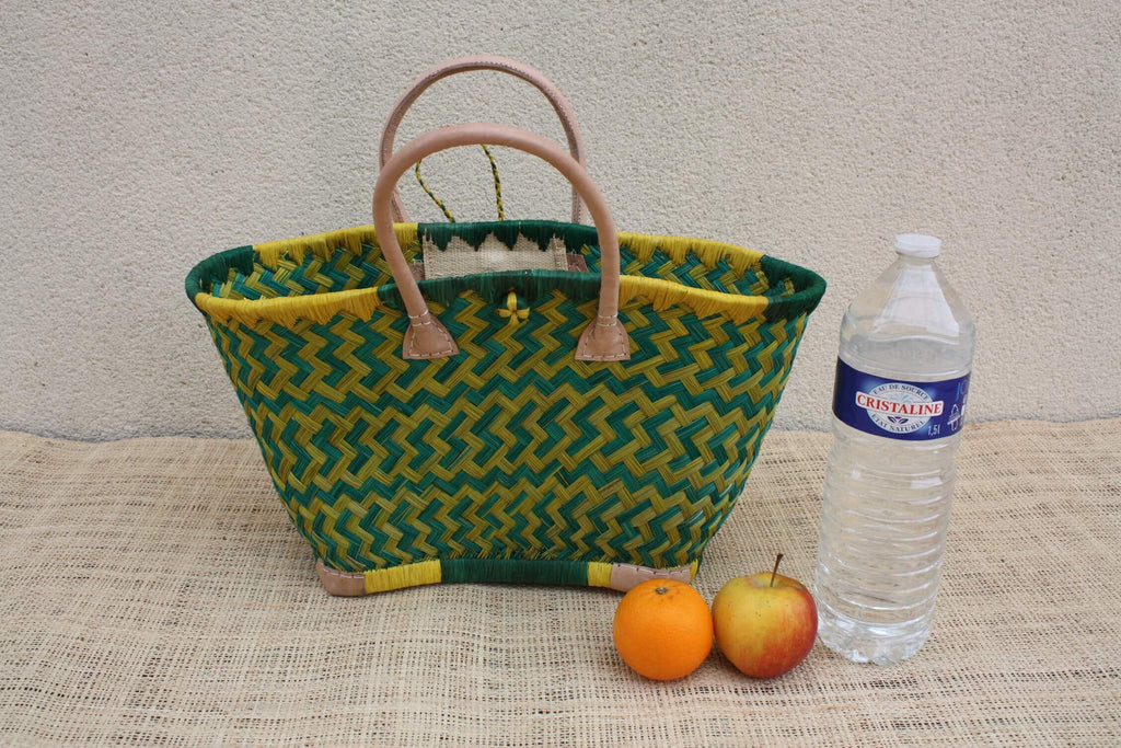 Panier osier vert & jaune – Sac plage cabas marché artisanal Madagascar, rotin tressé main, anses cuir (3 tailles)